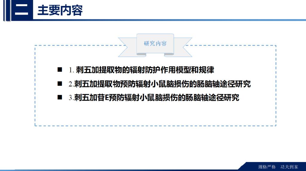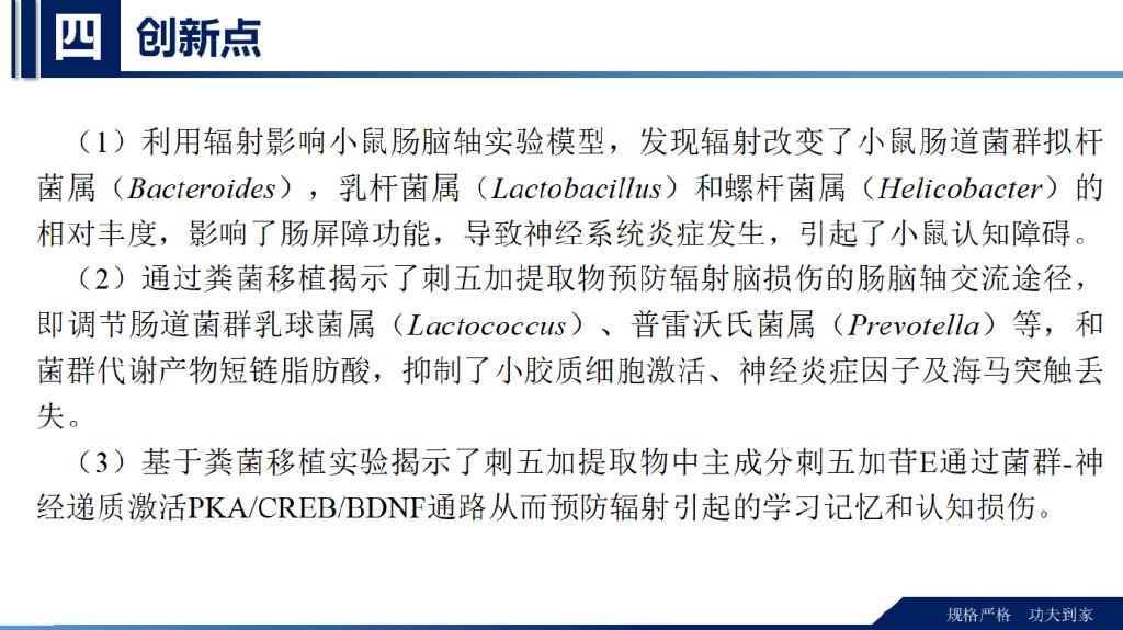 通过这3方面的研究确定刺五加提取物通过肠脑轴途径对辐射预防的作用模型和规律。